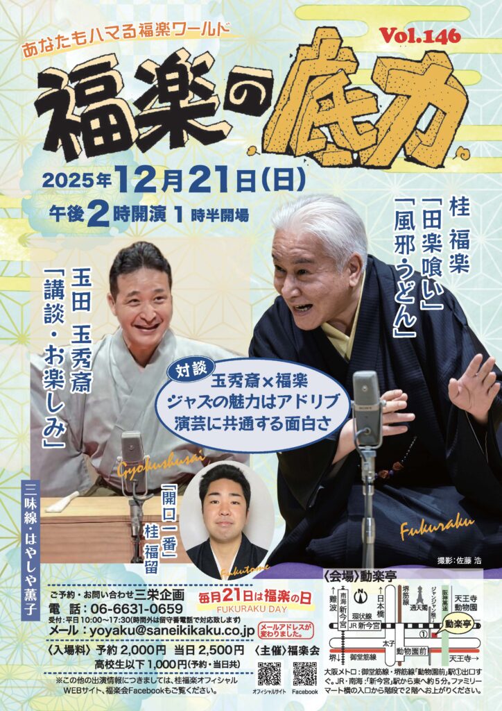 令和7年最後の底力は昼席です。私は、お金の無い連中が知恵を絞って酒にありつく「田楽喰い」と、寒い冬の一夜、大きな売り声を響かせるうどん屋を描いた「風邪うどん」の二席を演じます。ゲストは斬新な企画と演出で人気のある、講談師の玉田玉秀斎さんです。対談ではお互いに好きなジャズにまつわる話を語り合います。トップは私の弟弟子の福留君です。年末の慌ただしい時期ですが、笑いで気分をリフレッシュしていただけたらと思っています。どうぞ、ご来場のほどを!