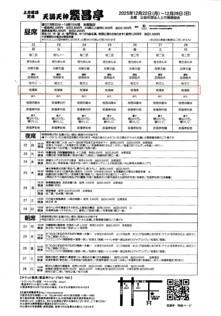 12月22日(月)から28日(日)の一週間は、繁盛亭昼席の出番です。独演会や二人会などと違って、寄席の通常公演では「ネタ出し」をしません。演者は当日の出番前や高座に出てからネタを決めるんです。日によってお客様の老若男女の比、通(ツウ)の方や初めての人などの層が変わりますから状況に最も適したネタを選ぶ訳でして、寄席ならではのルールです。誰がどんな落語を演るのか予想するのも楽しいですよ。お待ちしております。出演:桂二豆(23桂九ノ一)/桂ちきん/月亭文都/田渕岩夫(漫談)/桂文三/桂福楽~仲入~桂惣兵衛(23笑福亭呂竹)/笑福亭円笑/横山ひろし・春けいこ(漫才)/笑福亭松枝(27笑福亭枝鶴)
