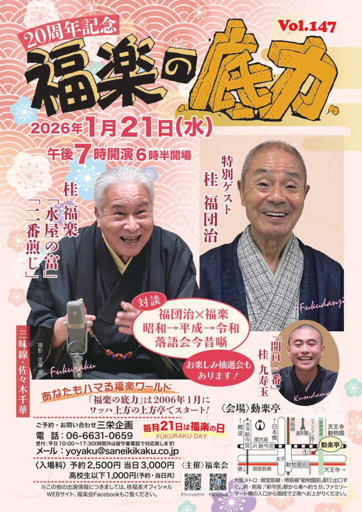 令和8年1月の[底力]は20周年記念 この記事が気に入ったらいいね!しよう 最新情報をお届けします。 2025.12.15 2006年にミナミにあるワッハ上方の上方亭で始まった「福楽の底力」。2026年1月におかげさまで20年の節目を迎えることになりました。これは申すまでもありませんが、お客様のご声援とスタッフの支え、そして耳かき3杯ほどのささやかな私の努力(ホンマかなぁ?)の賜物と思います。記念すべき今回は特別ゲストに師匠の福団治が登場。私は冬の情感たっぷりの「二番煎じ」と師匠直伝の「水屋の富」そしてお楽しみ抽選会と盛り沢山のラインナップです。ぜひともお越しくださいませ。
