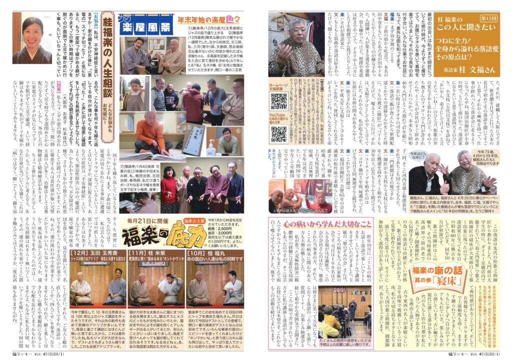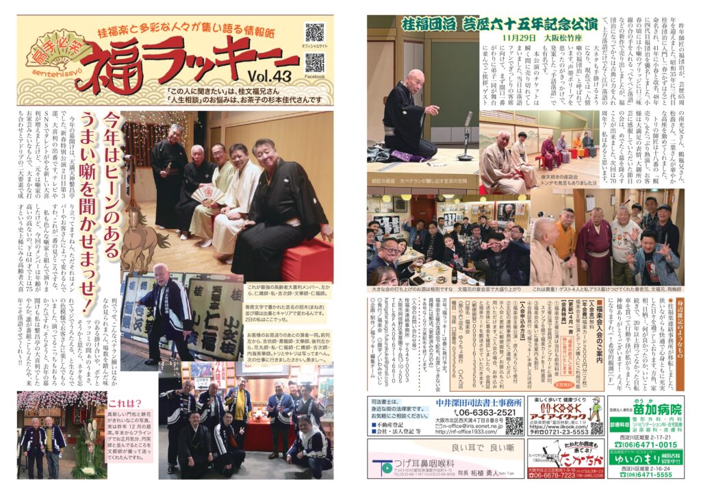 福ラッキーVol.43を発行 この記事が気に入ったらいいね!しよう 最新情報をお届けします。 2026.01.24 福楽会情報紙「福ラッキー」のVol.43を、1月21日の「福楽の底力」より配布しております。表紙は繁昌亭の新春公演、裏表紙では師匠・福団治の芸歴65周年記念・松竹座公演をご報告。好評の〈この人に聞きたい〉は文福兄さん、〈人生相談〉はお茶子の杉本佳代さん、その他盛りだくさんの内容です。ぜひお読みください。福楽会会員様には、同封するチラシなど準備ができ次第発送させていただきます。2月、3月の底力でもこの号をお渡しします。※サイドメニューからバックナンバーもお読みいただけます。