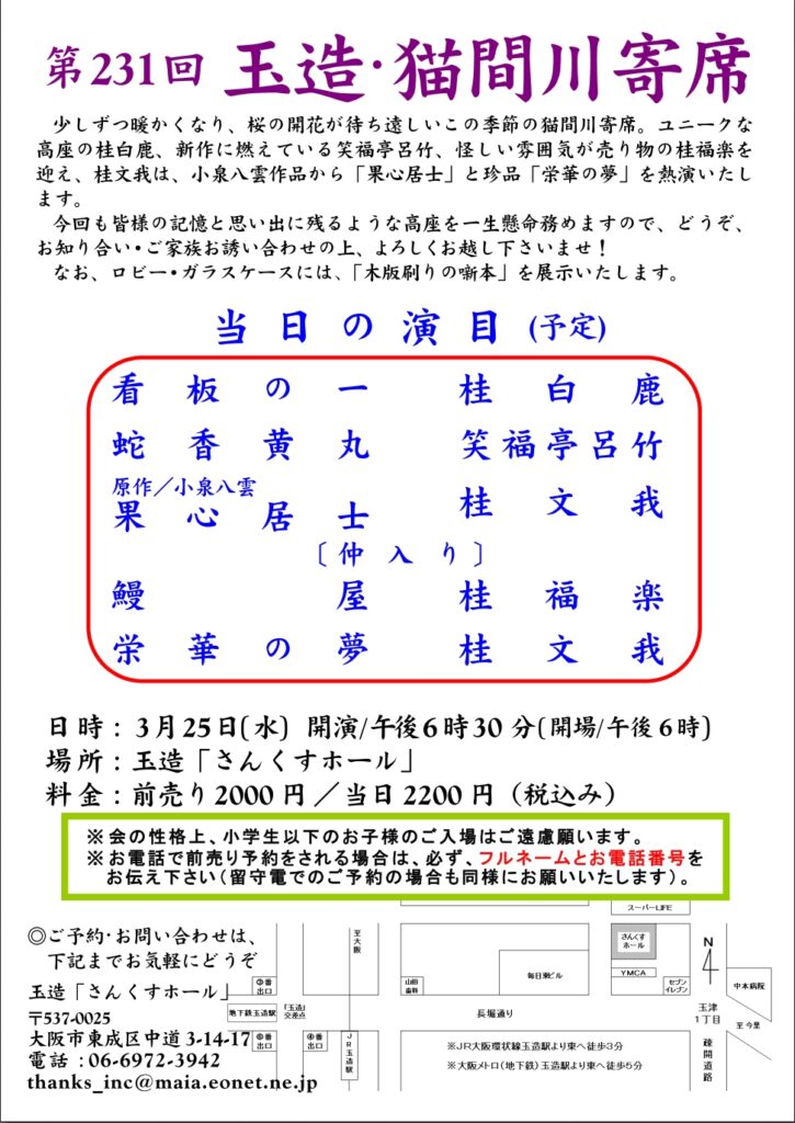 桂文我さんが大阪の玉造駅近くで毎月開催されている落語会です。持ちネタがとても多い文我さんですから、知らない落語を聴けるのが楽しみですよ。私のネタは会主自ら選んでもらった滅多に演らない「鰻屋」です。笑福亭呂竹師は新作落語を出しています。初めてお聴きになる噺をお時間までたっぷりとご堪能くださいませ。
