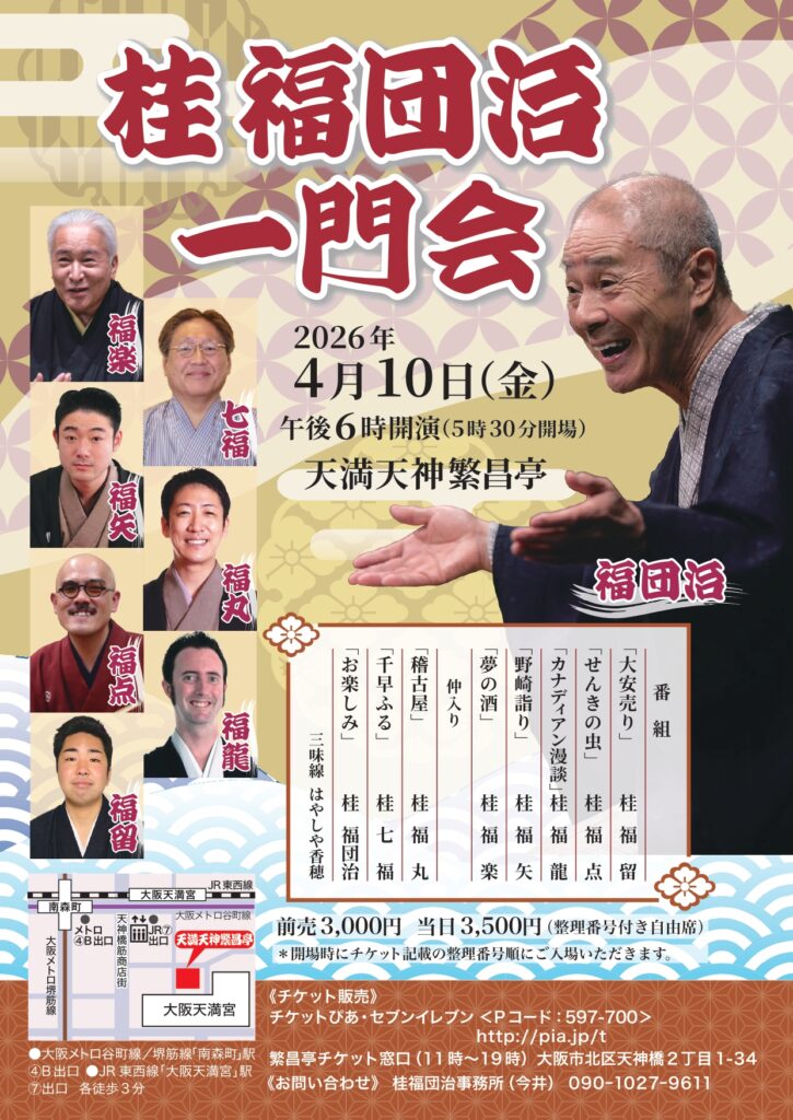 4/10(金)は[桂福団治一門会] この記事が気に入ったらいいね!しよう 最新情報をお届けします。 2026.03.09 4月10日(金)、我が福団治一門が繫昌亭に集結します。どこの一門でも弟子は師匠に似た芸風になり共通の色を持つものですが、ウチは珍しく各人の芸風が全く違い様々なカラーを放っております。今回も弟子はネタ出しで得意の演目を並べていますが、トリの師匠は「お楽しみ」。何を演じますか、乞うご期待! 6時の開演で8席たっぷりお聞きいただきます。ぜひともお運びくださいませ。お待ちしています。