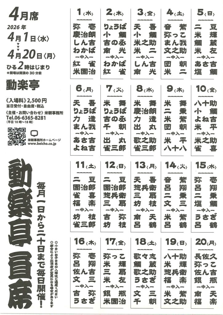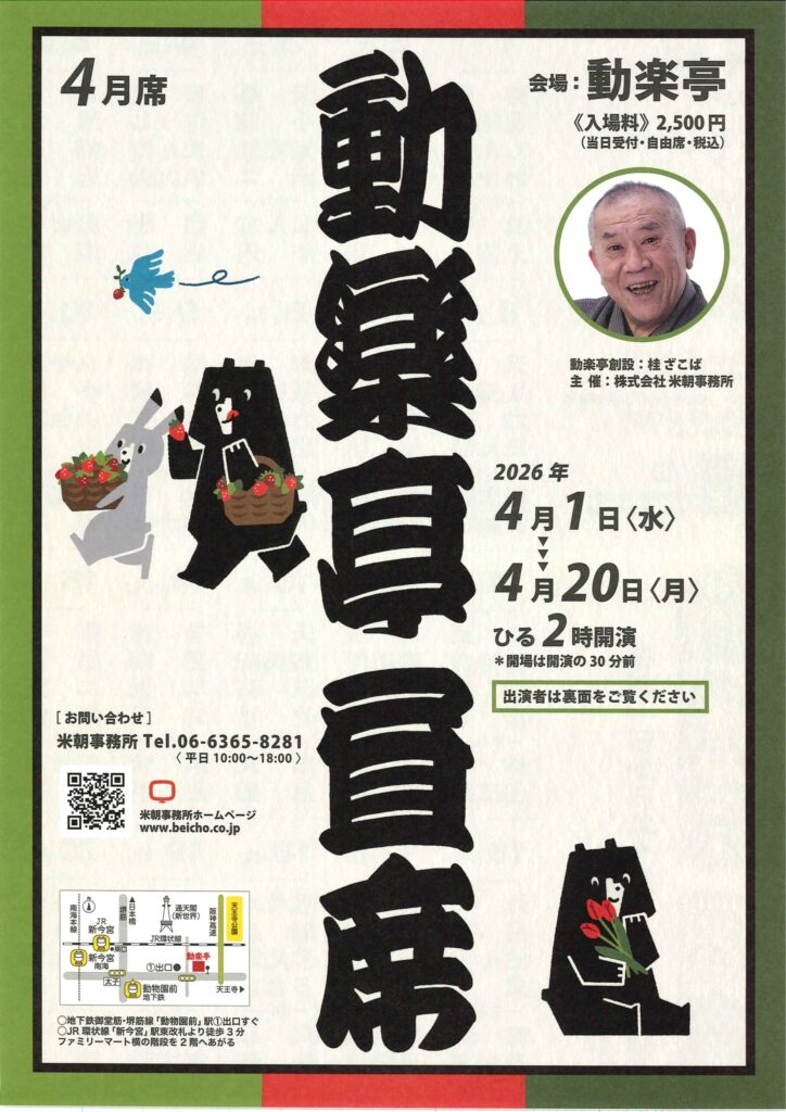 4/11(土),19(日),20(月)動楽亭昼席に この記事が気に入ったらいいね!しよう 最新情報をお届けします。 2026.03.20 毎月1日から20日まで毎日開催されている動楽亭昼席に出演します。11日(土)と19日(日)は中トリで、20日(月)はトリです。14時開演、2,500円(当日受付・自由席)。落語だけ6席という寄席の定席、「福楽の底力」とはちがった私の一面をお見せします。ぜひご来場ください。