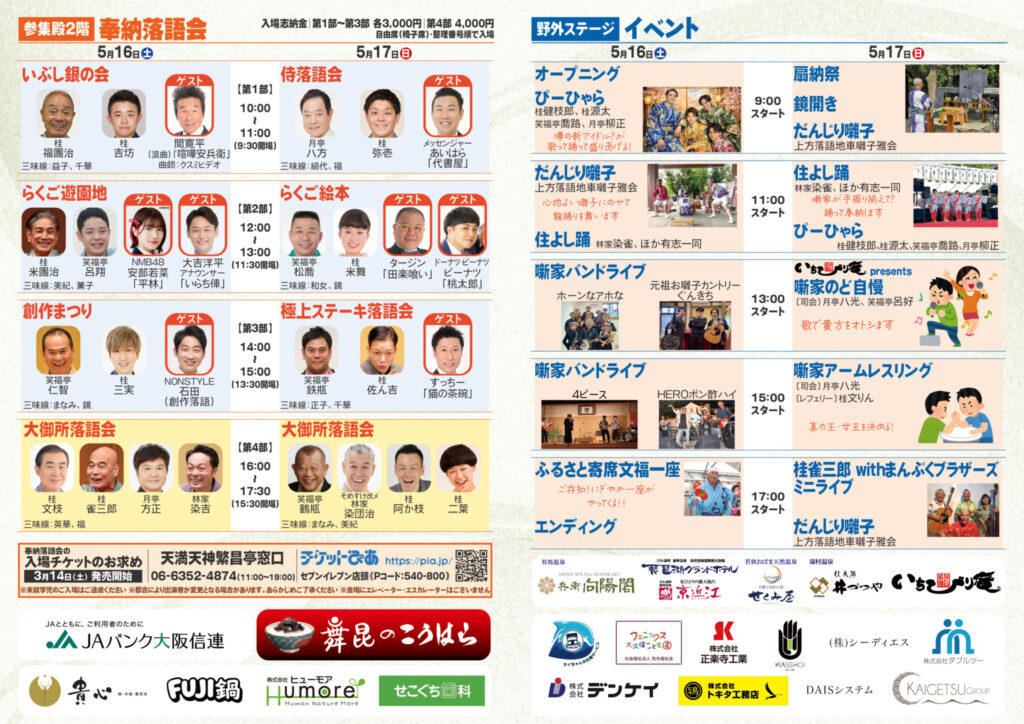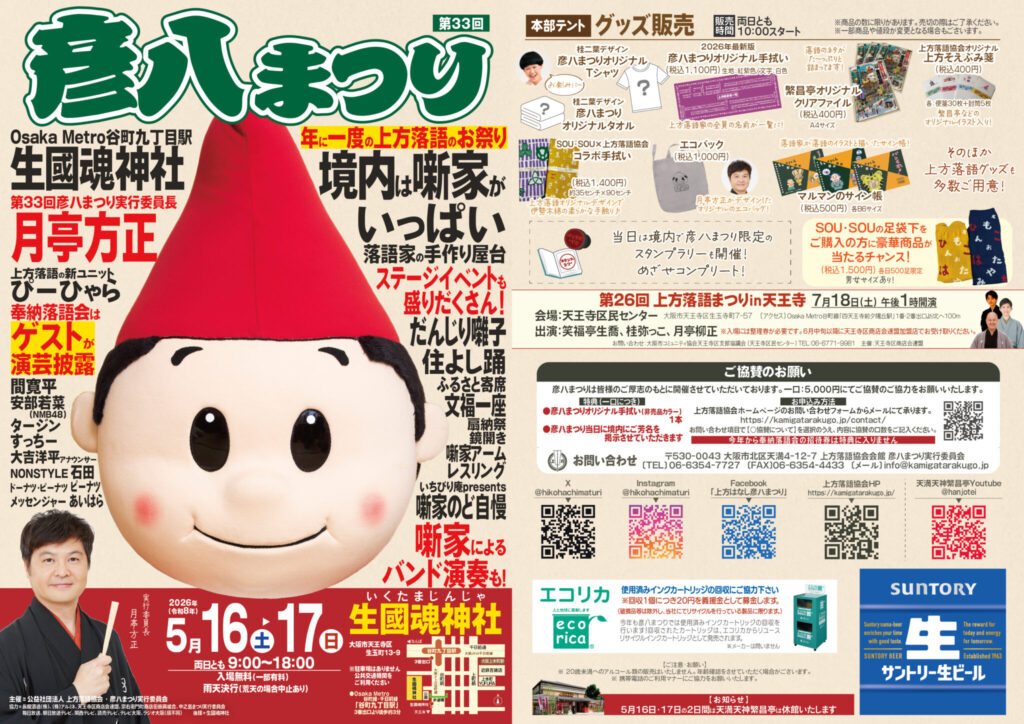 年に一度の上方落語のお祭り「彦八まつり」 今年もありまっせ! 我々上方の噺家の始祖である初代米澤彦八が活躍した生國魂神社で、2日間に渡り開催します。令和8年は、5月16日(土)・17日(日)9時~18時まで。参集殿での落語はもちろん、野外ステージでは、住よし踊や噺家バンドライブ、だんじり囃子、今回私も出る噺家のど自慢などなど、盛り沢山のイベント。境内には噺家の屋台がいっぱい並びます。福楽の人生相談もありますよ。今回の実行委員長は月亭方正師。彼ならではのゲストもわんさかやってきます。準備の様子など、新しい情報はfacebookやXなどでどんどん紹介されていきます。どうぞお楽しみに。※今年からご協賛の特典に参集殿・奉納落語会での招待券はありません。奉納落語会のチケットはチケットぴあ(Pコード540-800)、または繁昌亭チケット窓口でお求めください。
